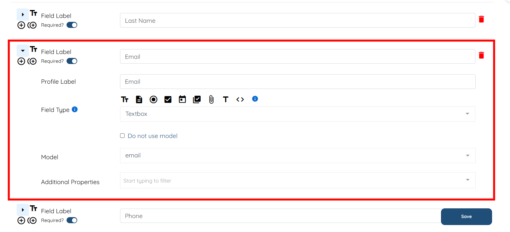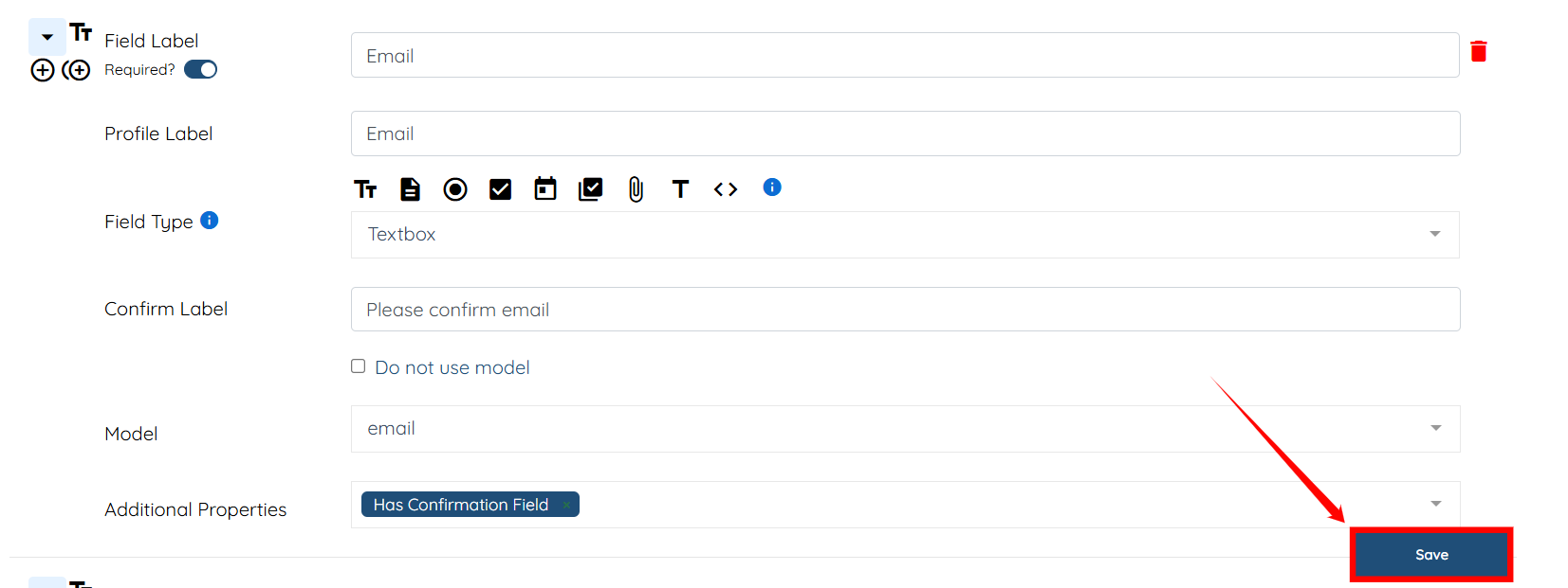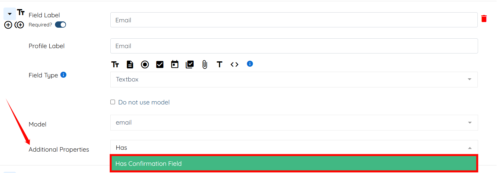 Step 4: In the Additional Properties field, select the Has Confirmation Field option.