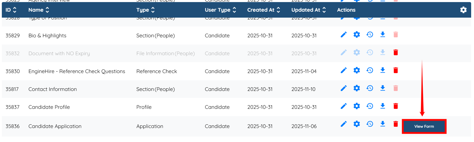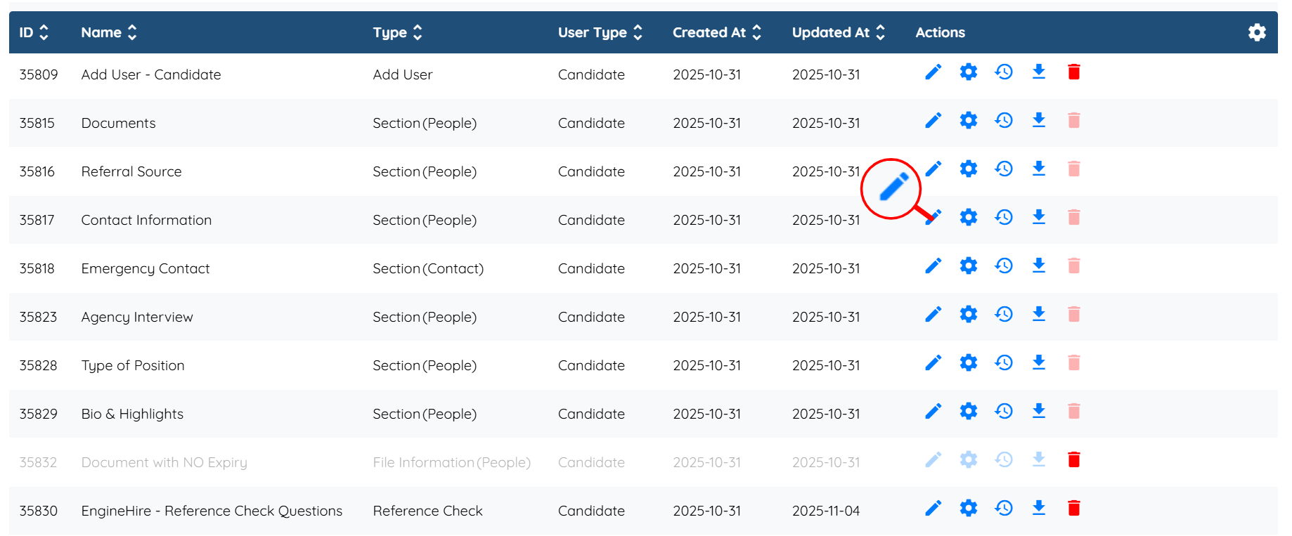 Step 2: Locate the section where you want to add a confirmation field, and then click the Pencil icon corresponding to that section in the Actions column.