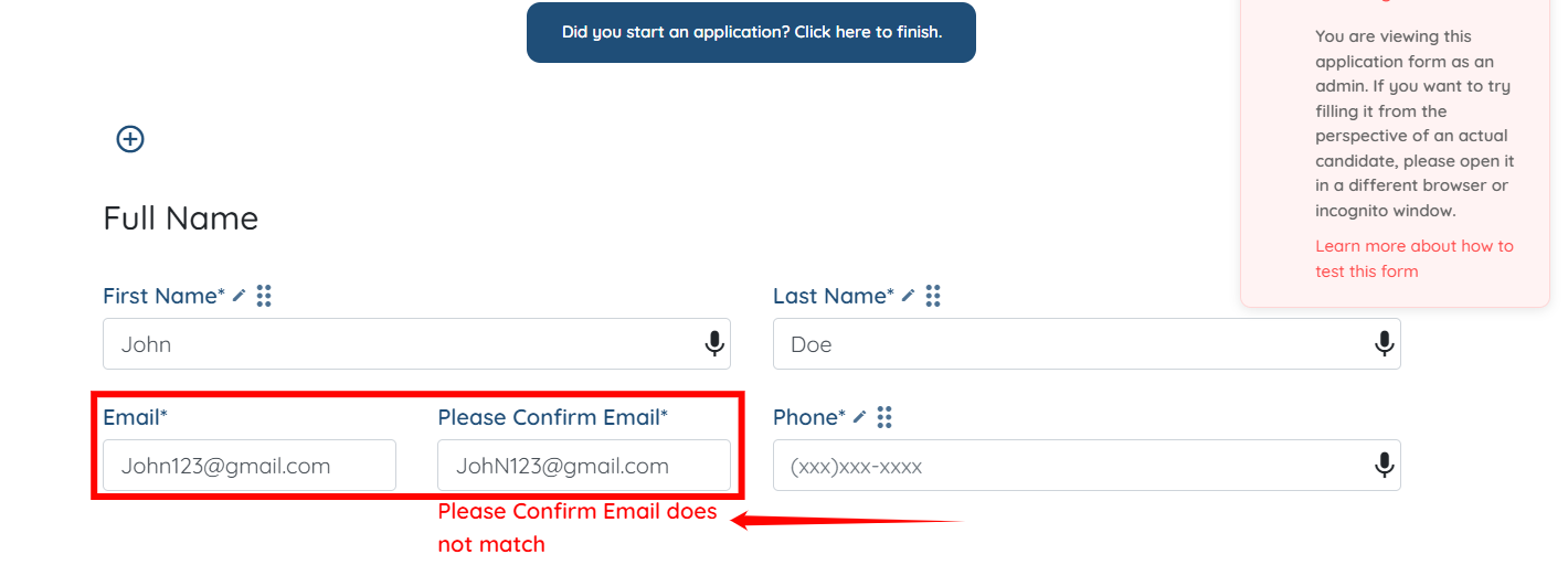 Once the confirmation field is added, an error will appear if the entered values do not match, as shown in the screenshot below.