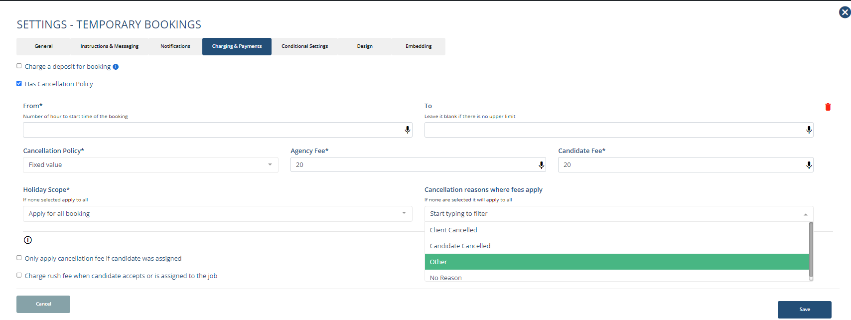 Choose from the list of options in the Cancellation Policy dropdown and adjust the Agency/Candidate Fee accordingly.