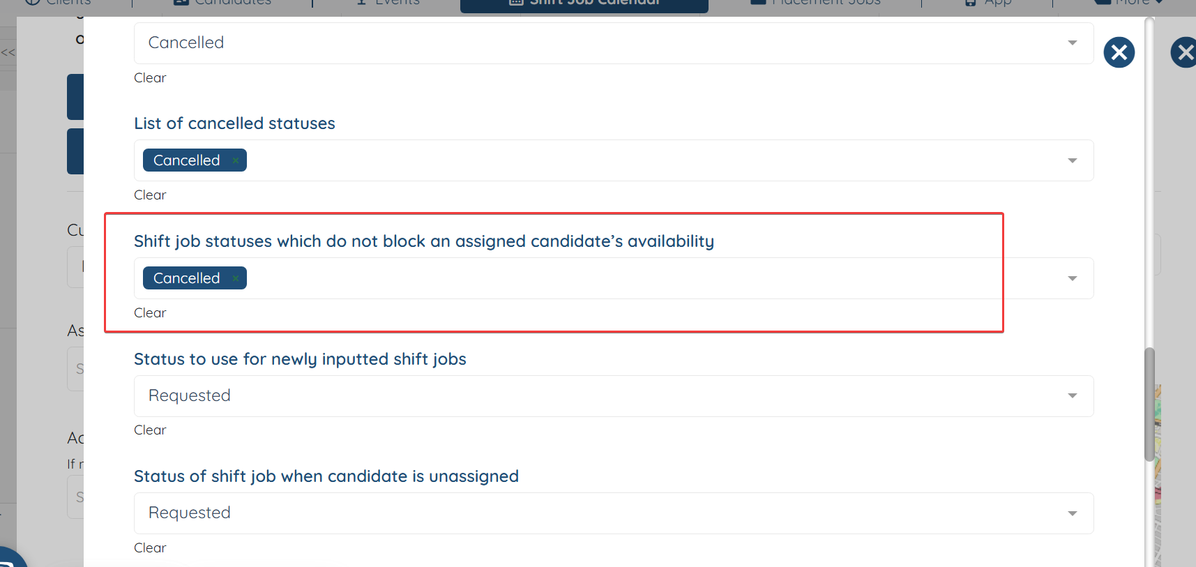 Scroll down till you find the setting "Shift job statuses which do not block an assigned candidate’s availability"