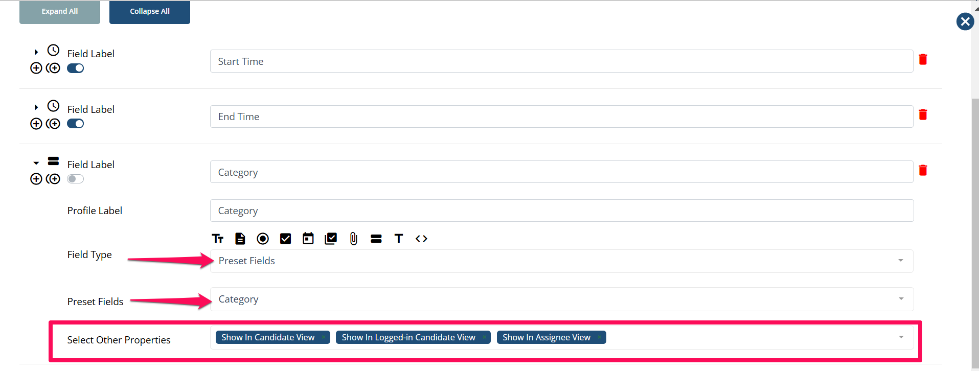 Add the following properties to the Select other properties field (Show in Candidate View, Show In Logged-in Candidate view, Show in Assignee View)