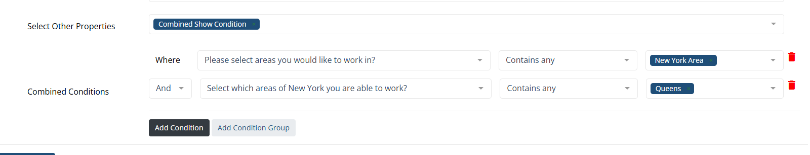 Pick the question you want and the response the client or candidate must select for the question to appear.