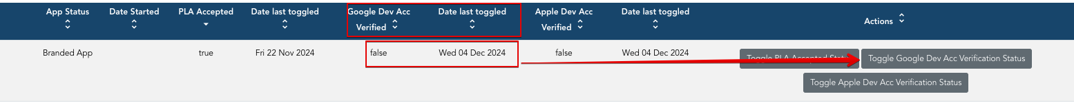 Click the "Toggle Google Dev Acc Verification Status" button.
