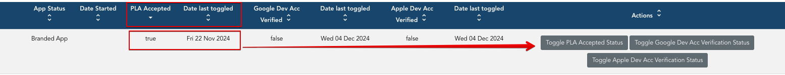 Verify that the "PLA Accepted" status updates to "true" or "false" accordingly: