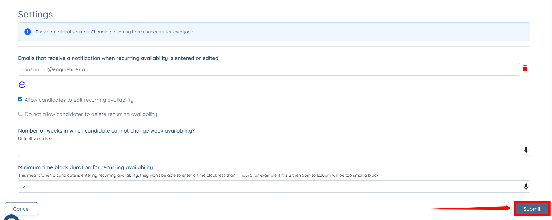 Step 7: Check the Allow candidates to edit recurring availability checkbox if you want the candidate to edit their recurring availability; otherwise, leave it unchecked.