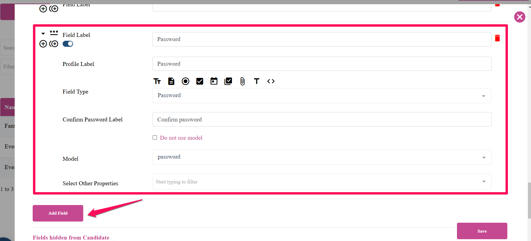 Model: This is a critical field. Ensure the model is set to "password"; otherwise, the field will not work as intended. The field's functionality relies on the correct model. If the "password" model is not available in the dropdown and no duplicate password field exists on the application form, contact us, as the field will not function without the correct model.