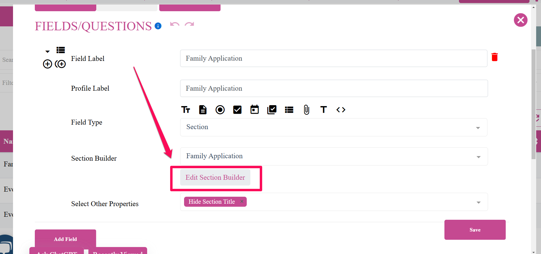 Once you have decided a section to add the password field click the "Edit Section Builder" button for that section to begin editing it. Make sure to expand the section to see the edit section builder.