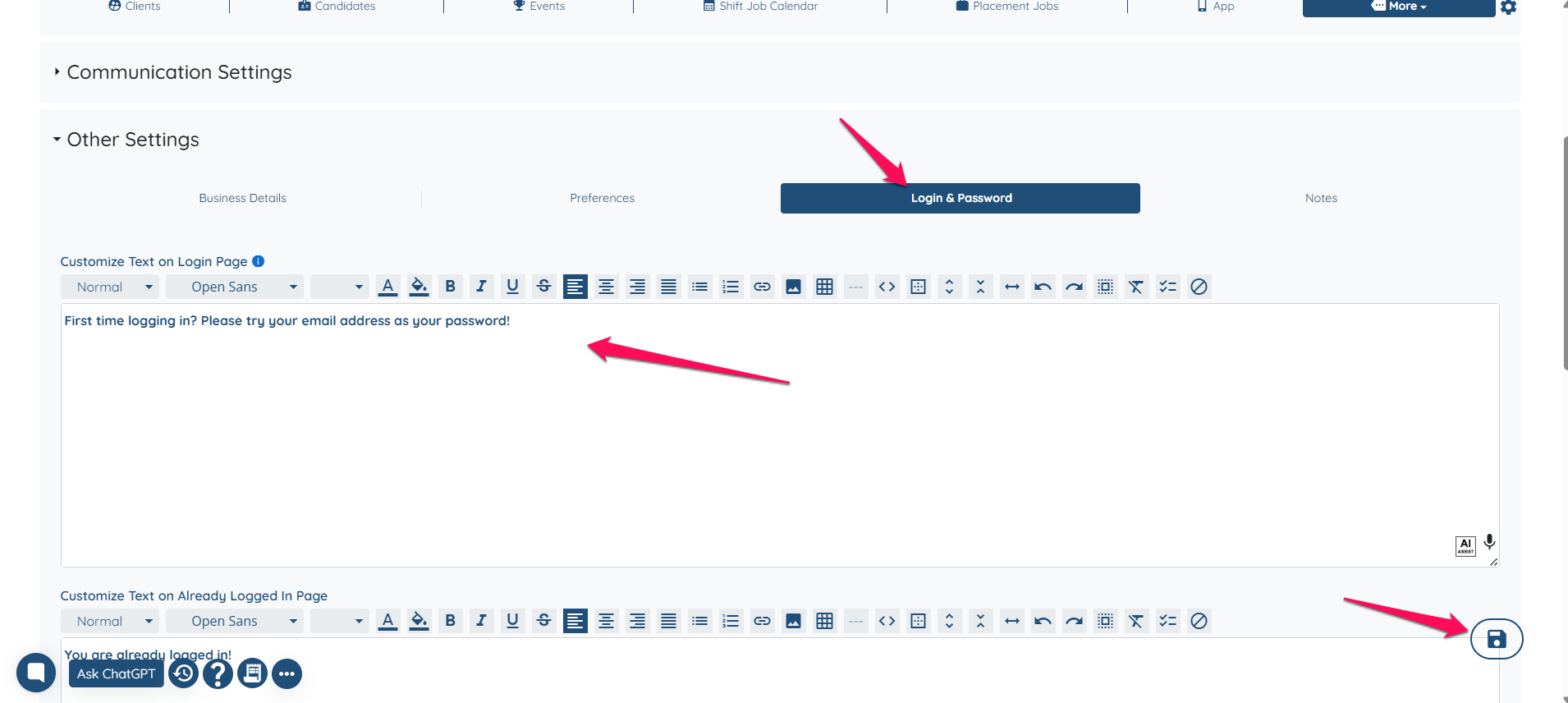 Log in, Password and Customize Text on Login Page, and then update settings.