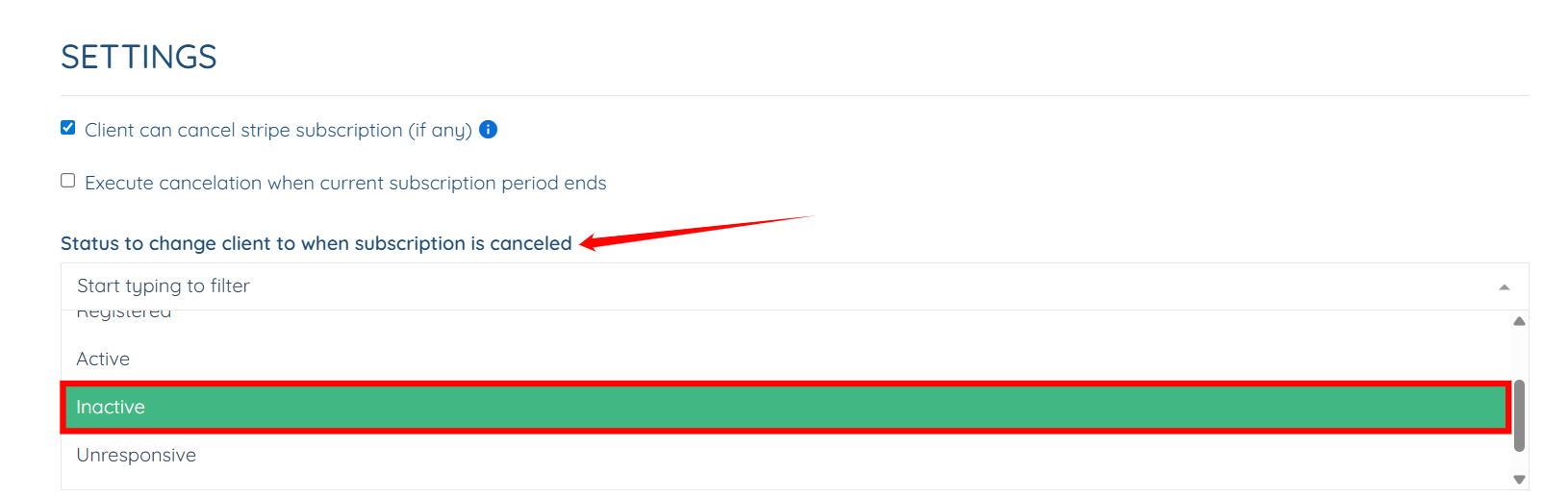 Step 5: Select the status from the “Status to change client to when subscription is cancelled” dropdown.