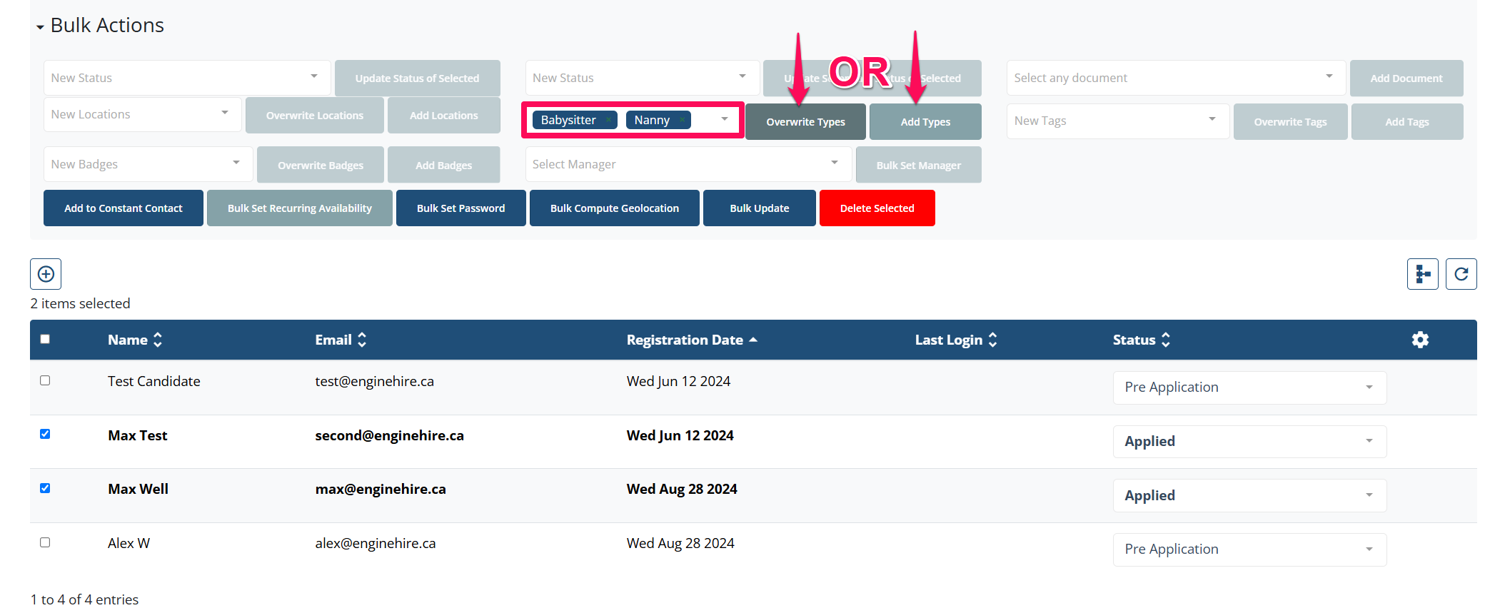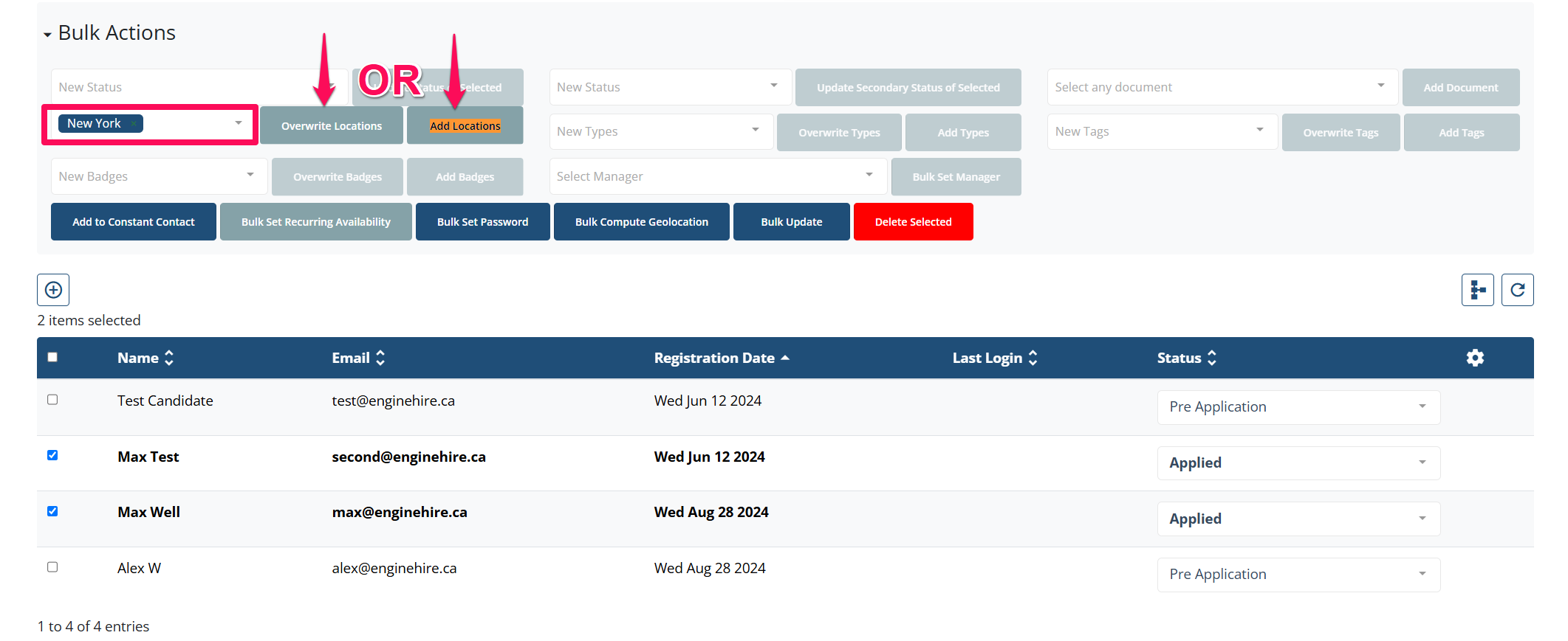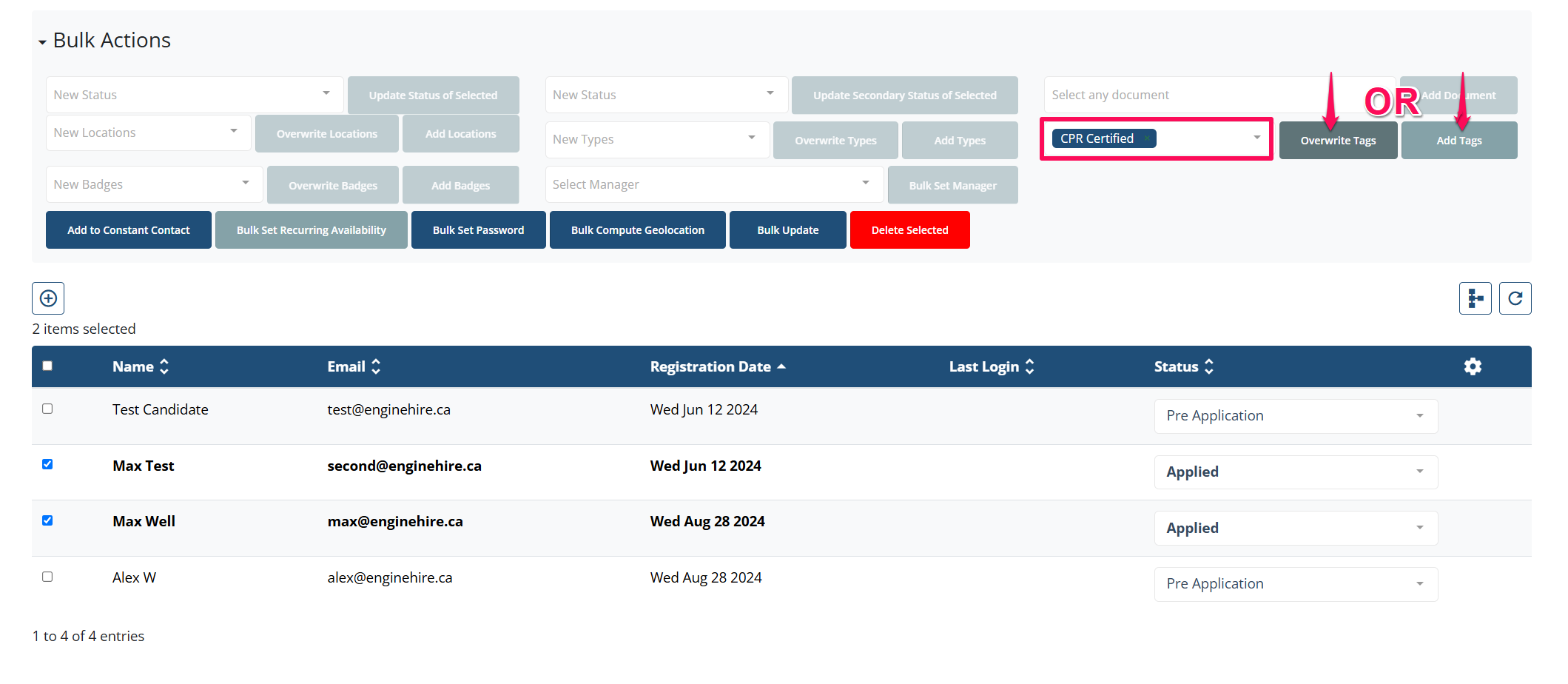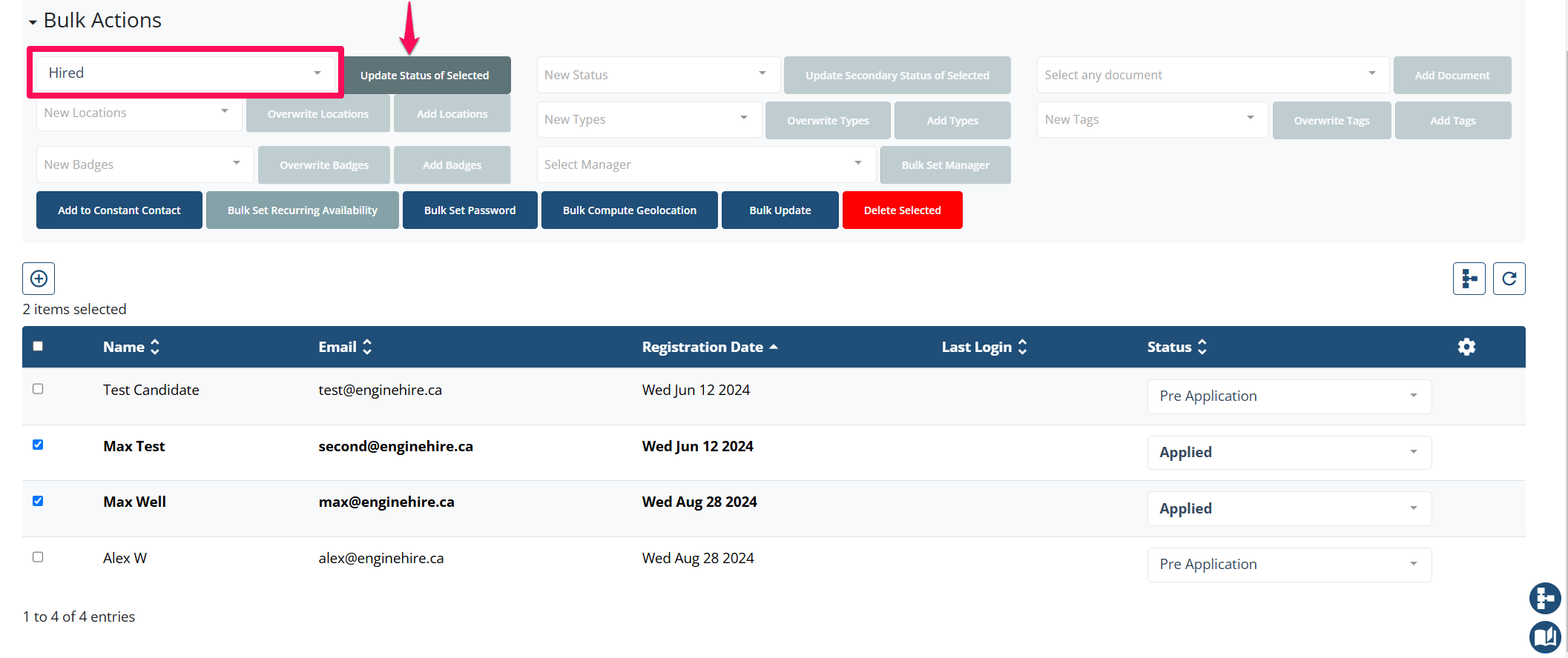2. Select multiple required candidates by clicking the small boxes at the beginning of each record or you can also click the top header row box to select all available records.