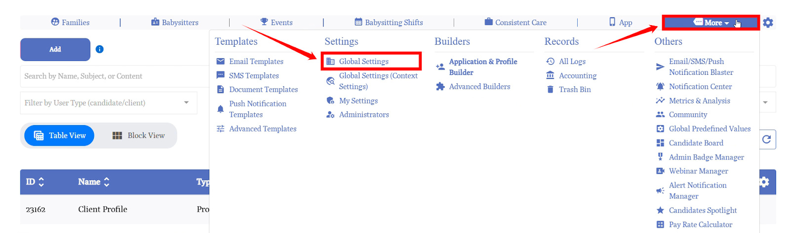 Step 1: Log in to your agent dashboard, and click More > Global Settings, as shown in the screenshot below.