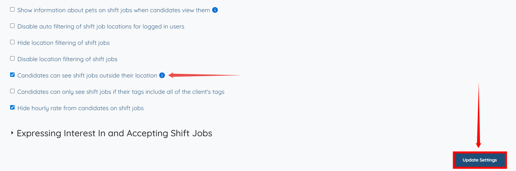 Step 6: Check the Candidates can see shift jobs outside their location checkbox, and then click the Update Settings button to proceed.