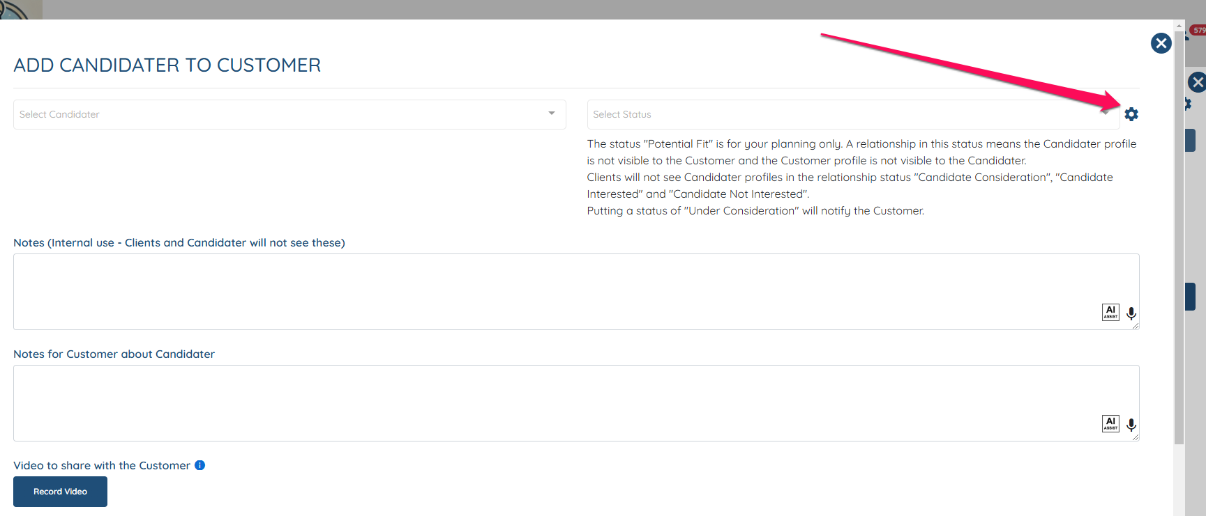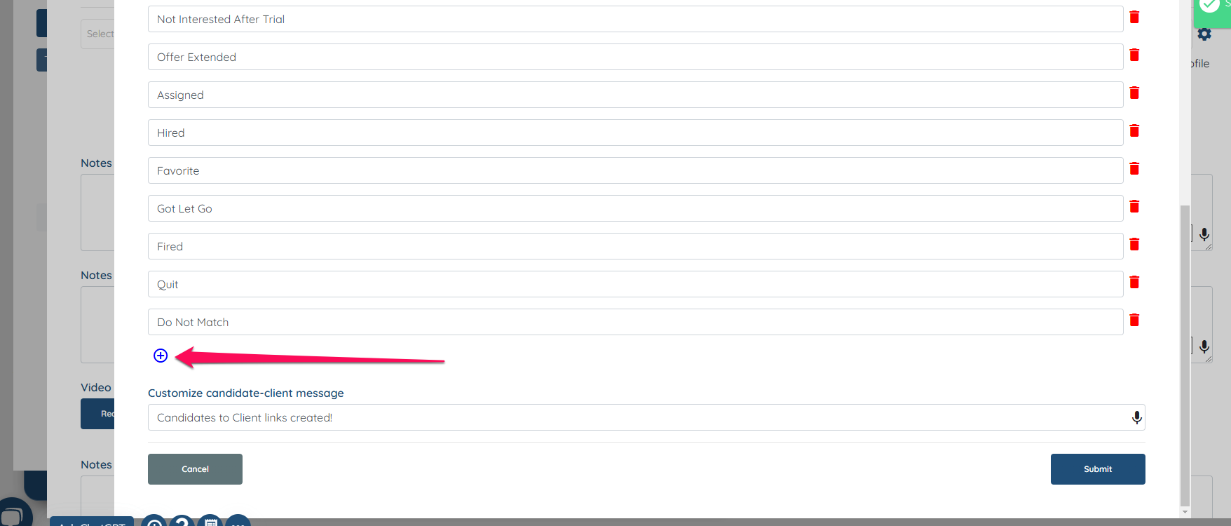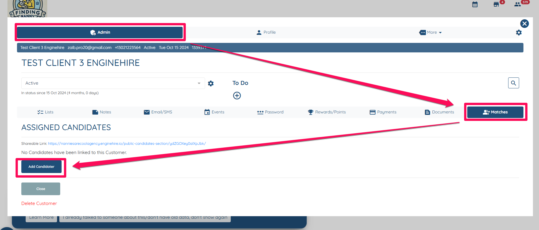 - Open a client profile, navigate to the Admin tab, click on "Matches," and then select "Add Candidate."