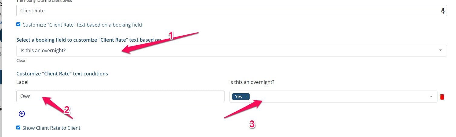 Select the booking field you want to have the text be based on. Then select the Plus icon, add the label and add the condition.