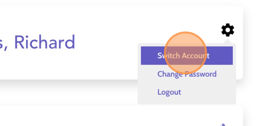 7. To switch accounts, the user will click the gear icon in the top right corner of their dashboard welcome message and simply select Switch Account