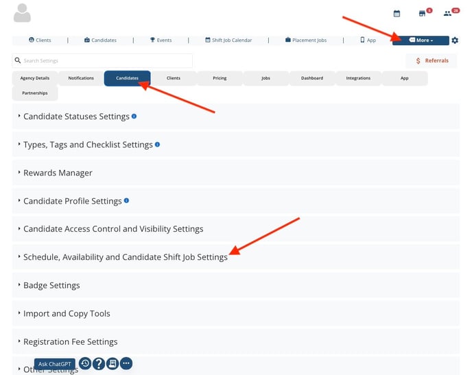 1. Navigate to Global Settings → Candidates → Schedule, Availability and Candidate Shift Job Settings