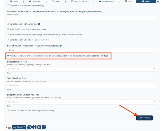 2. Scroll down to the setting labeled 'View full candidate profile when client clicks on an assigned shift job or is selecting a candidate for a shift job.' Check the box to the left to activate this setting and select 'Update Settings'
