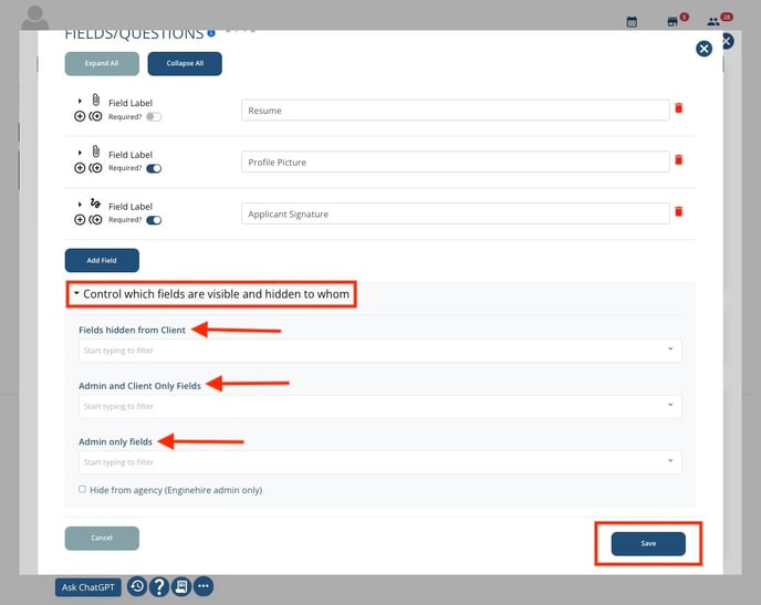 9. Here, you can choose to hide fields from clients, make a field visible to both clients and admins, or restrict it to admins only. Once you’ve made your selections, click Save to apply the changes: