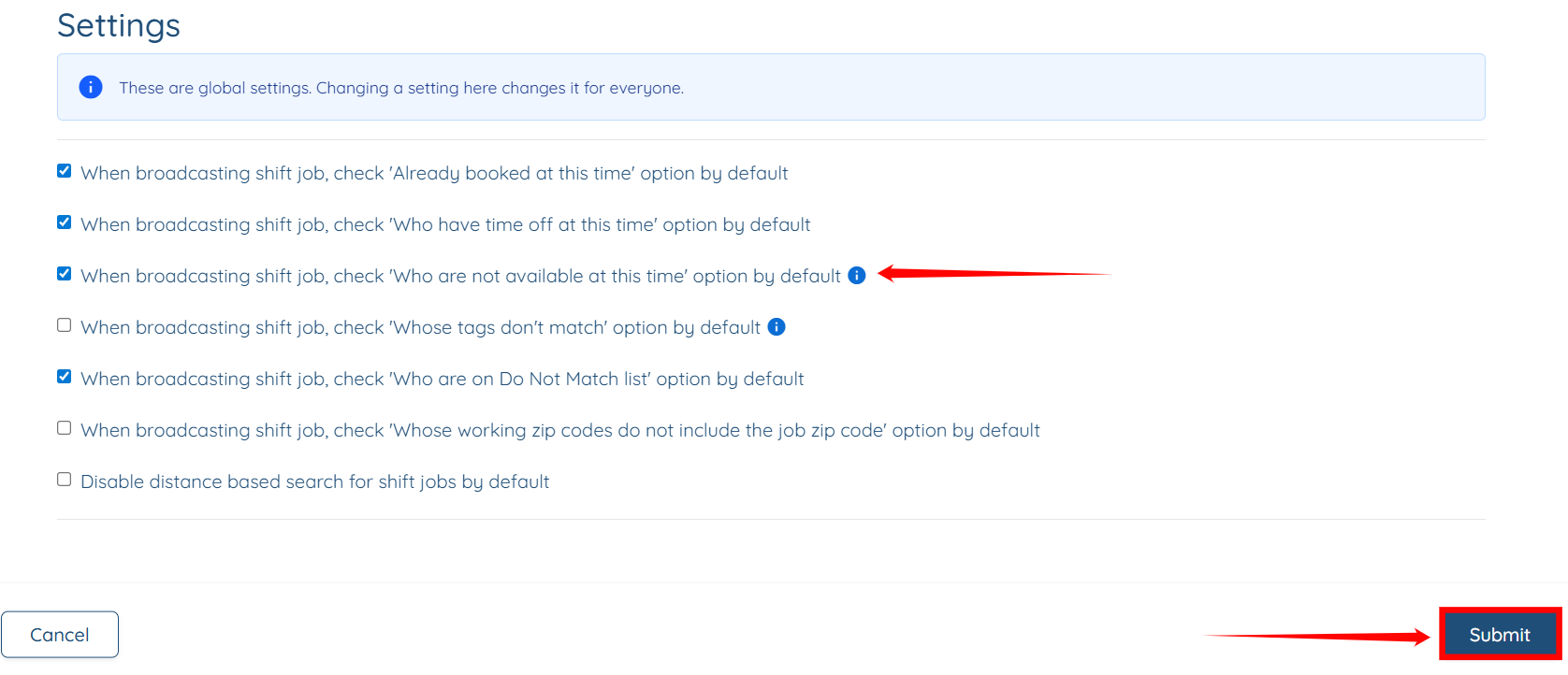 Step 5: Check the When broadcasting shift job, check 'Who are not available at this time' option by default checkbox, and then click the Submit button to save the changes.