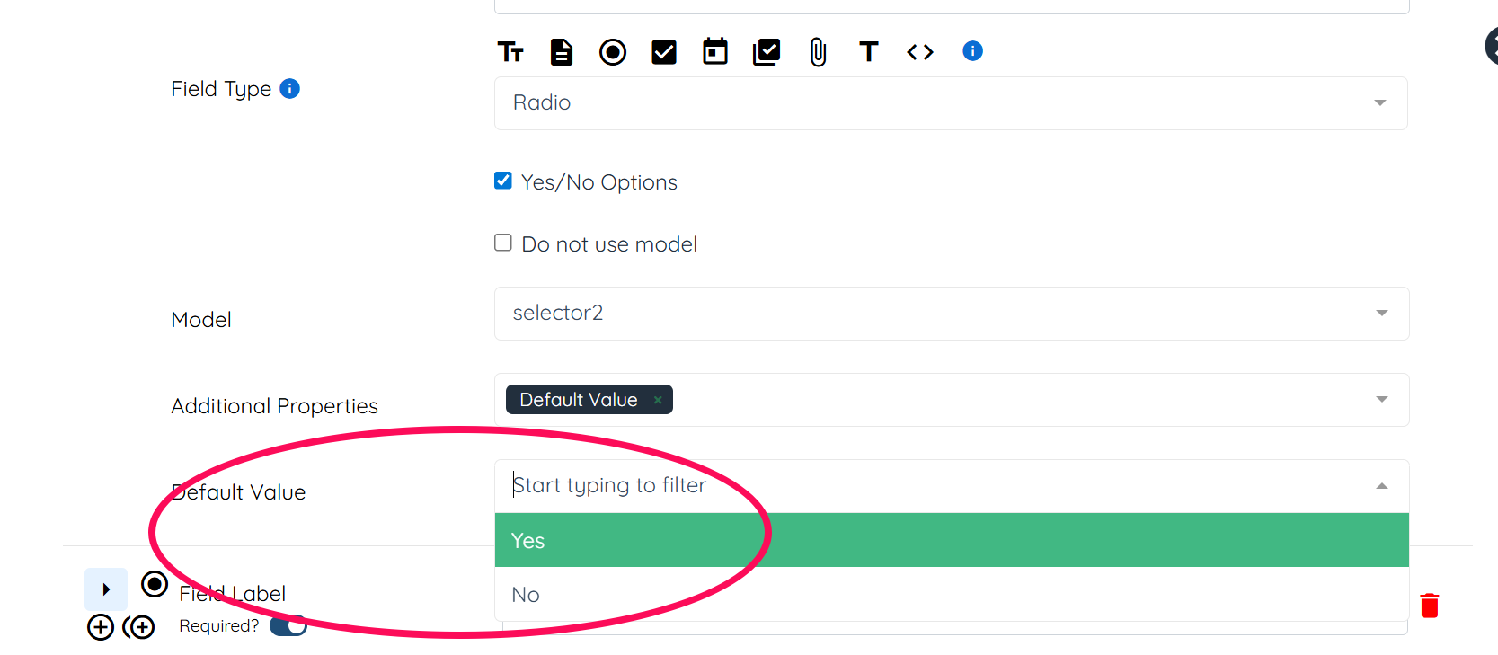 A new box labeled Default Value will appear. If the type allows free text, you can type in the pre-filled answer. For options like Yes/No or multiple-choice, simply select the default option from the dropdown.