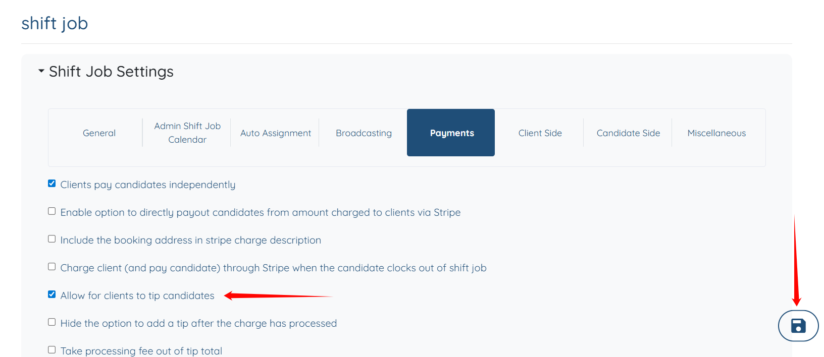 Step 4: Uncheck the Allow for clients to tip candidates checkbox, and then click the Save icon to proceed.