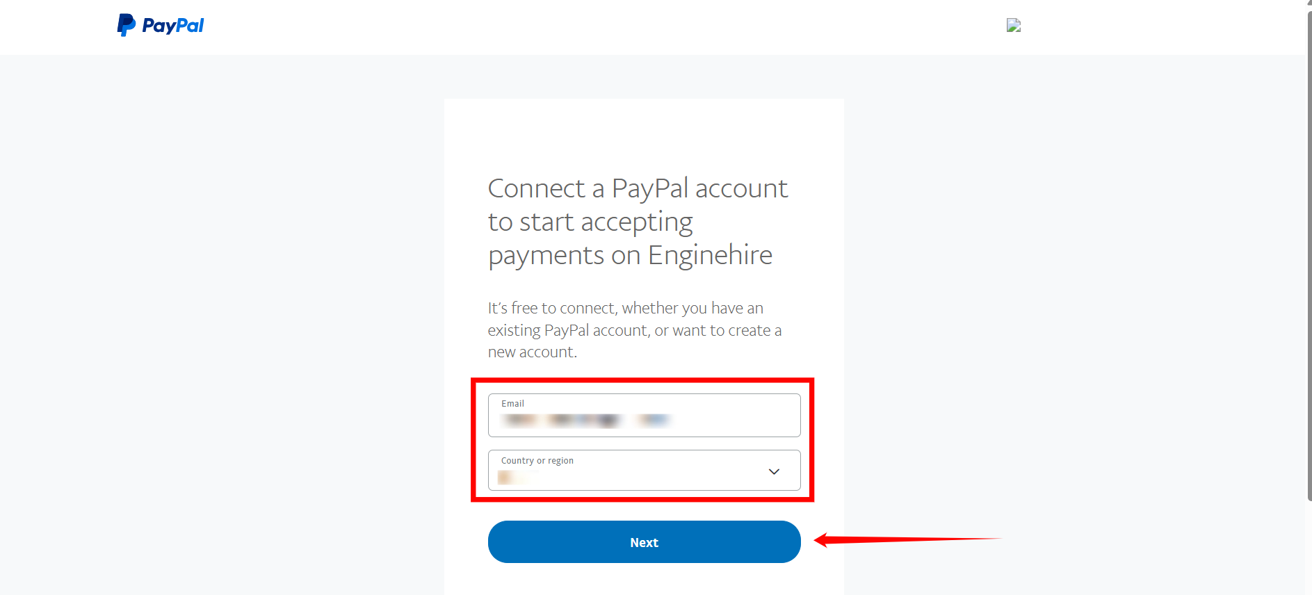 Step 4: Enter the email address associated with your PayPal account, select your country or region, and then click the Next button to continue.