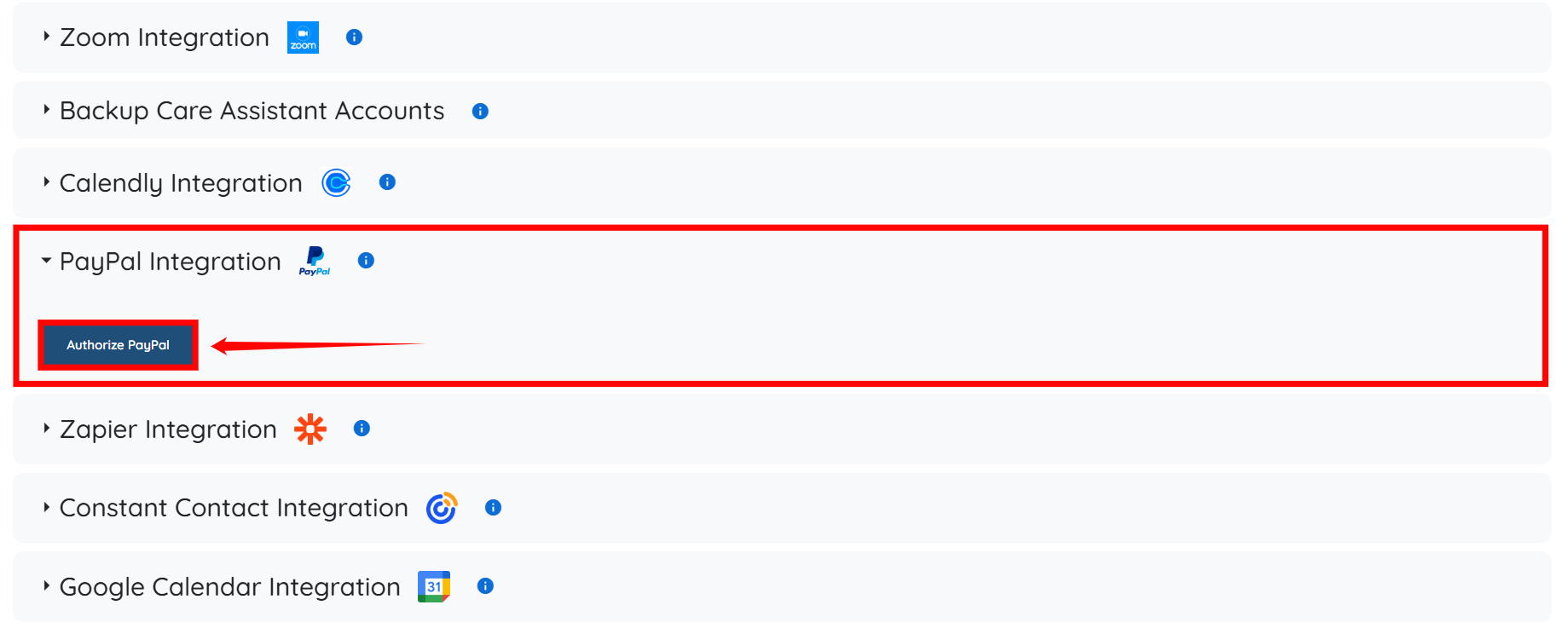 Step 3: Locate and expand the PayPal Integration option from the list of available integrations. After that, click on the Authorize PayPal button to continue.