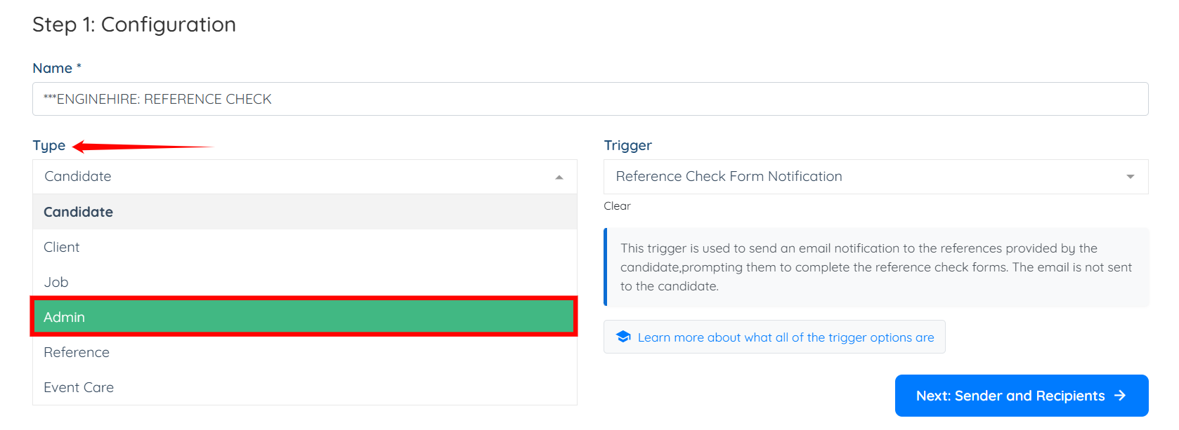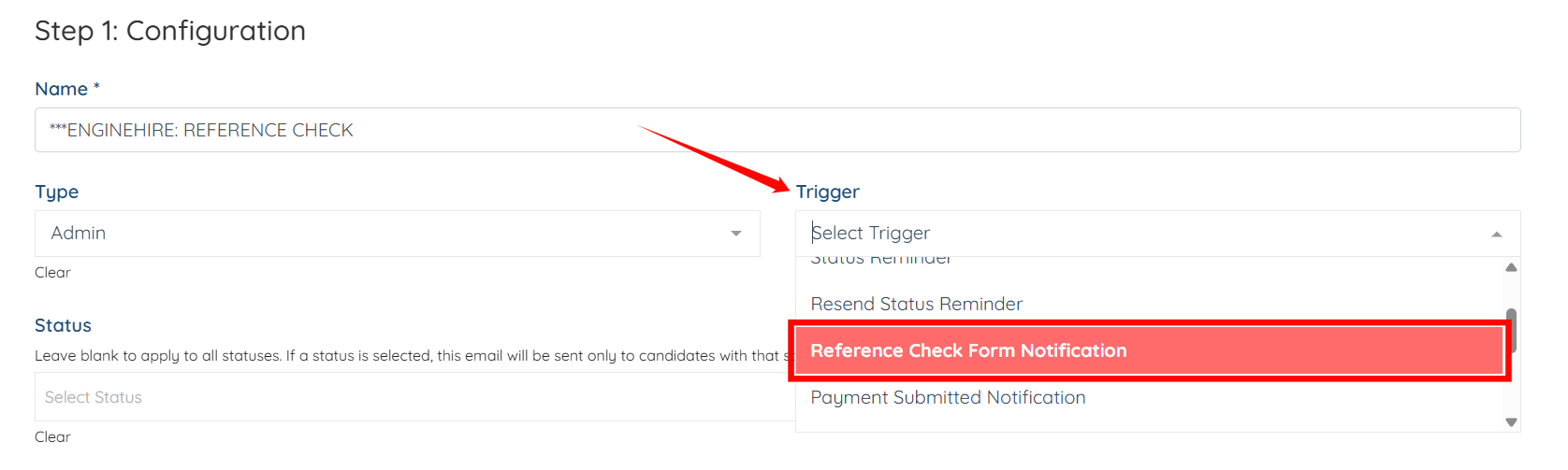 Step 4: Select the notification category for which you want to receive notifications from the Trigger dropdown menu. For demonstration purposes, we are using “Reference Check Form Notification.”