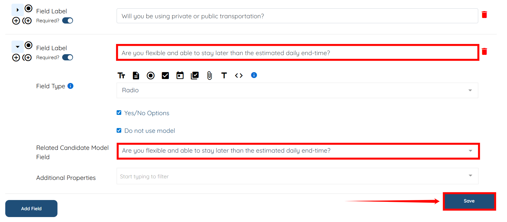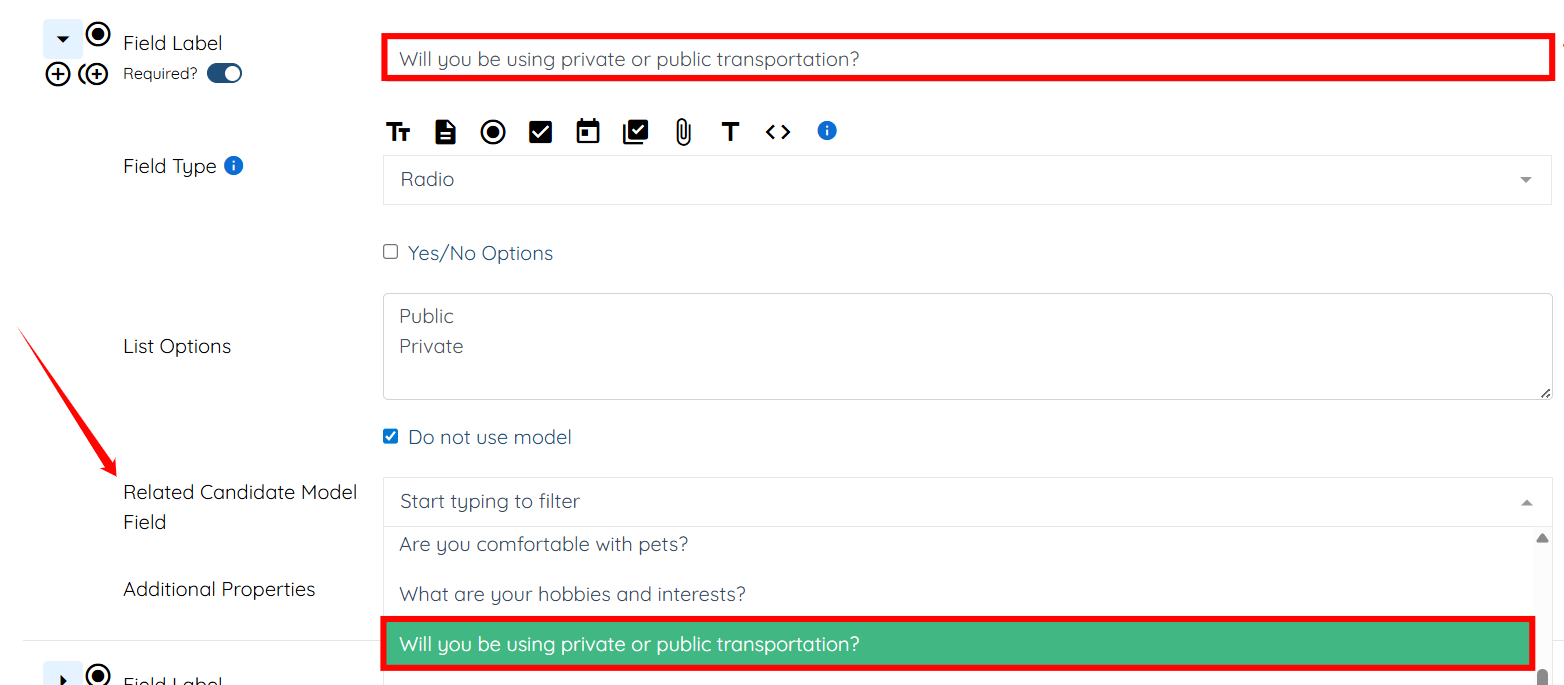 Step 5: In the Related Candidate Model Field dropdown, select the same question as in the Field Label field.