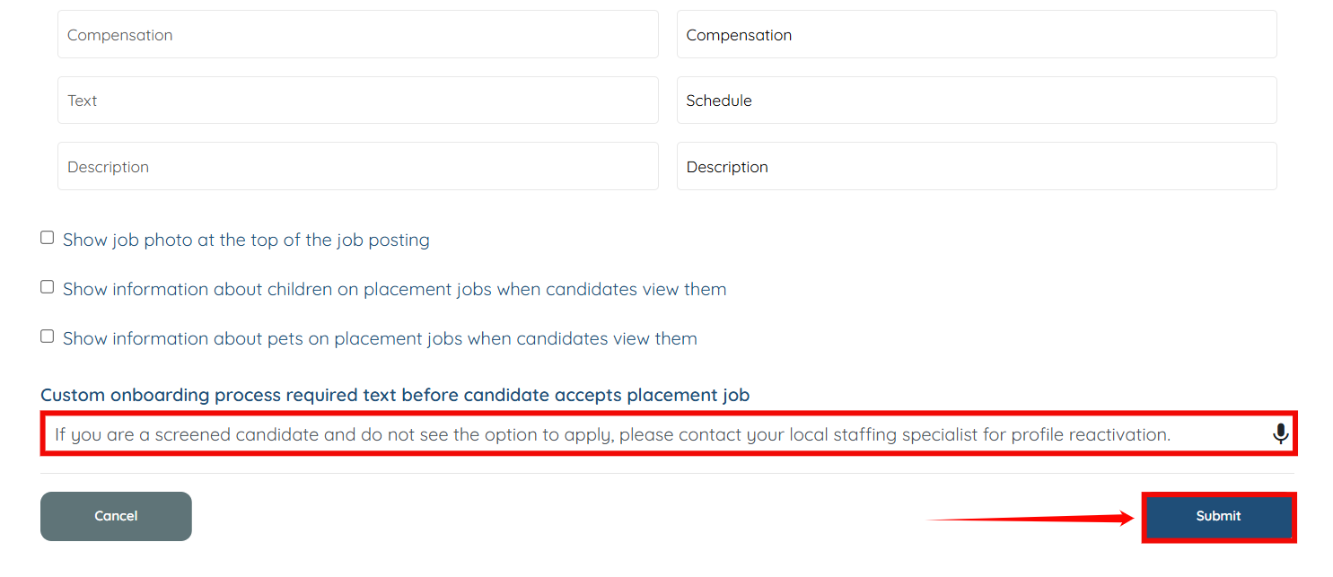 Step 5: Scroll down to the bottom of the page, enter your customized onboarding message as required, and then click the Submit button to continue.