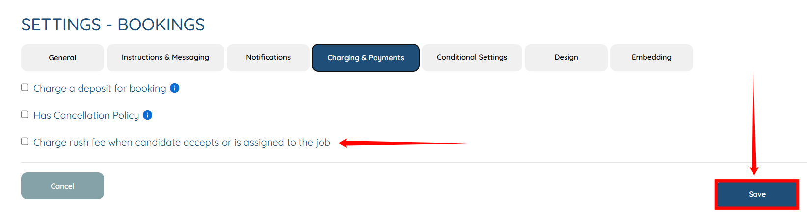 Step 4: Click to select the Charge rush fee when candidate accepts or is assigned to the job checkbox, and then click the Save button to proceed.
