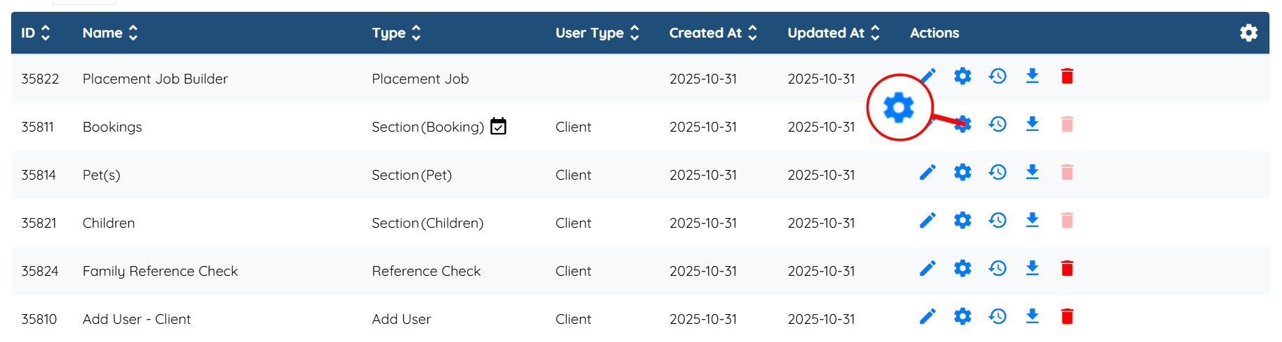 Step 2: Locate the booking form where you want to enable the charge rush feature, and then click the Gear icon associated with that form in the Actions column.