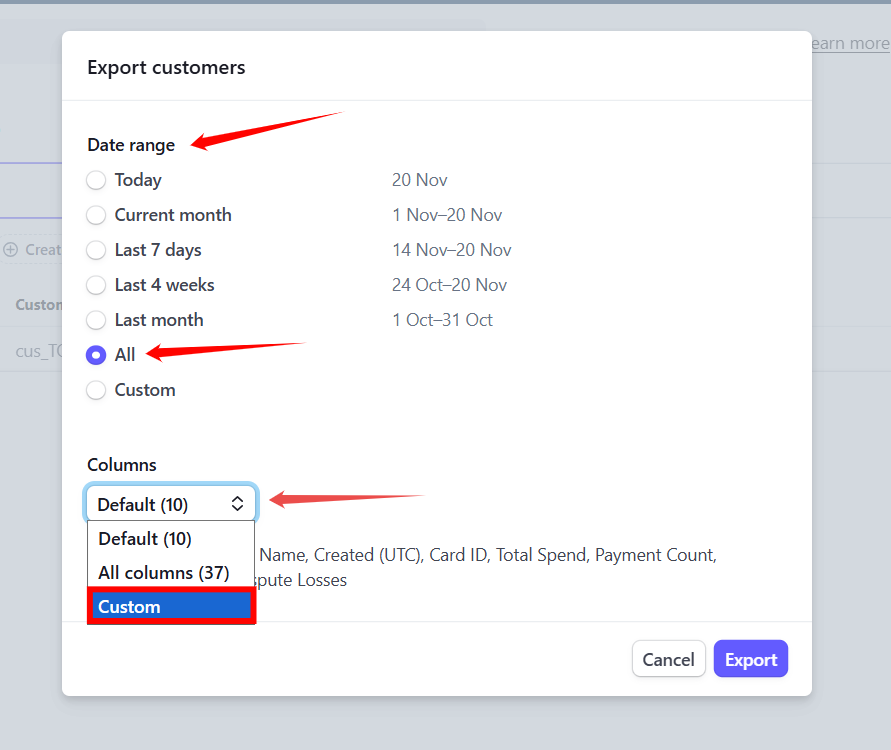Step 3: Select the All radio button option from the Date range, and choose the Custom option from the Columns dropdown.