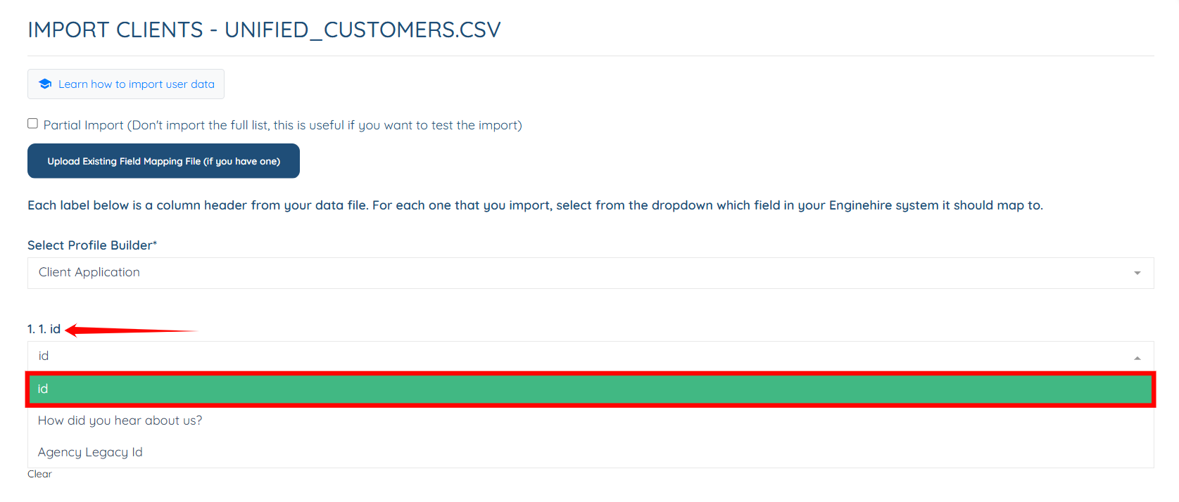 Step 5: Select the id field from the dropdown for the label id. The id label then maps to the selected id field in the Enginehire system.