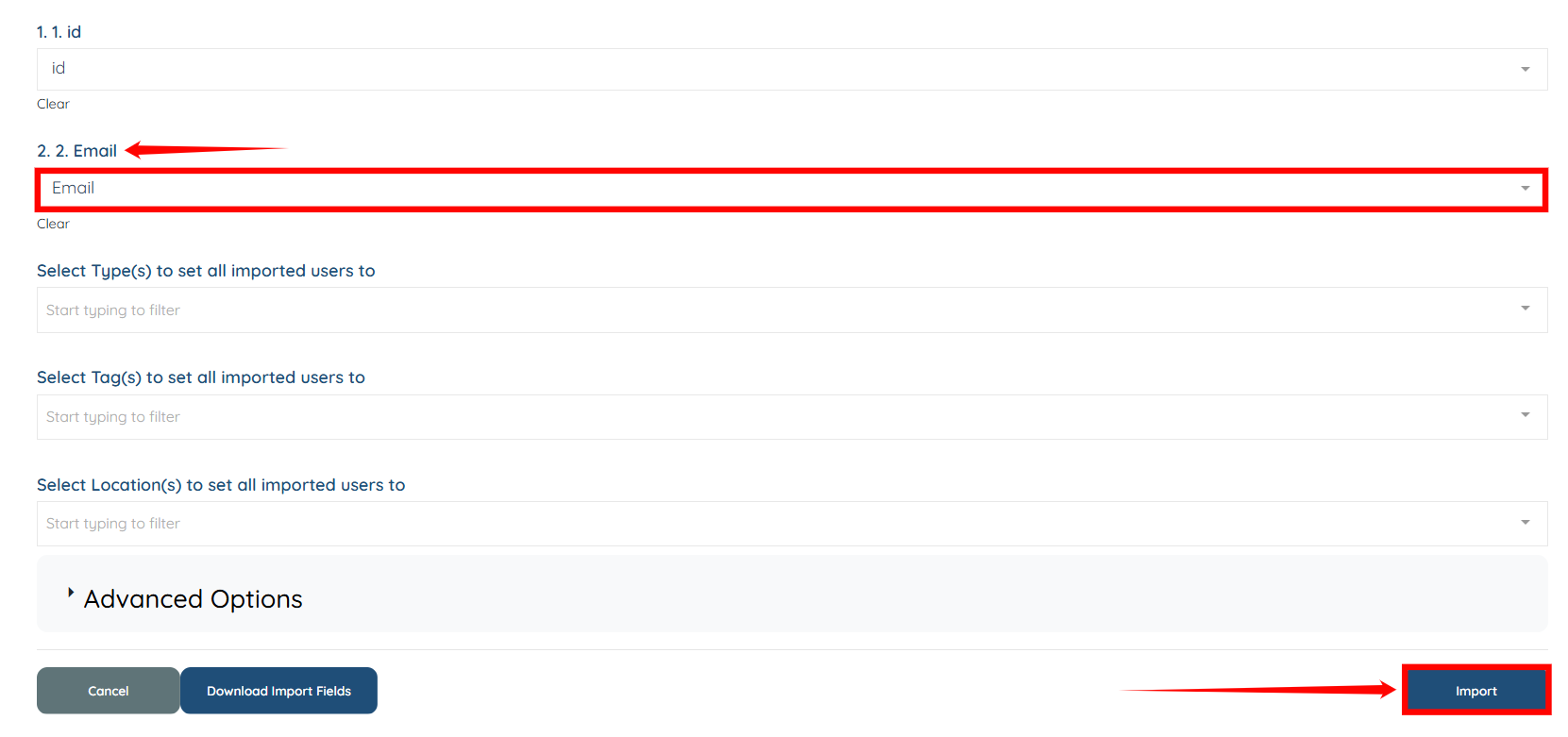 Step 6: Similarly select the Email field for the Email label. Then, click on the Import button to import the data into Enginehire.