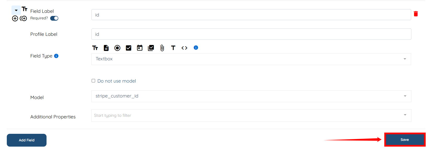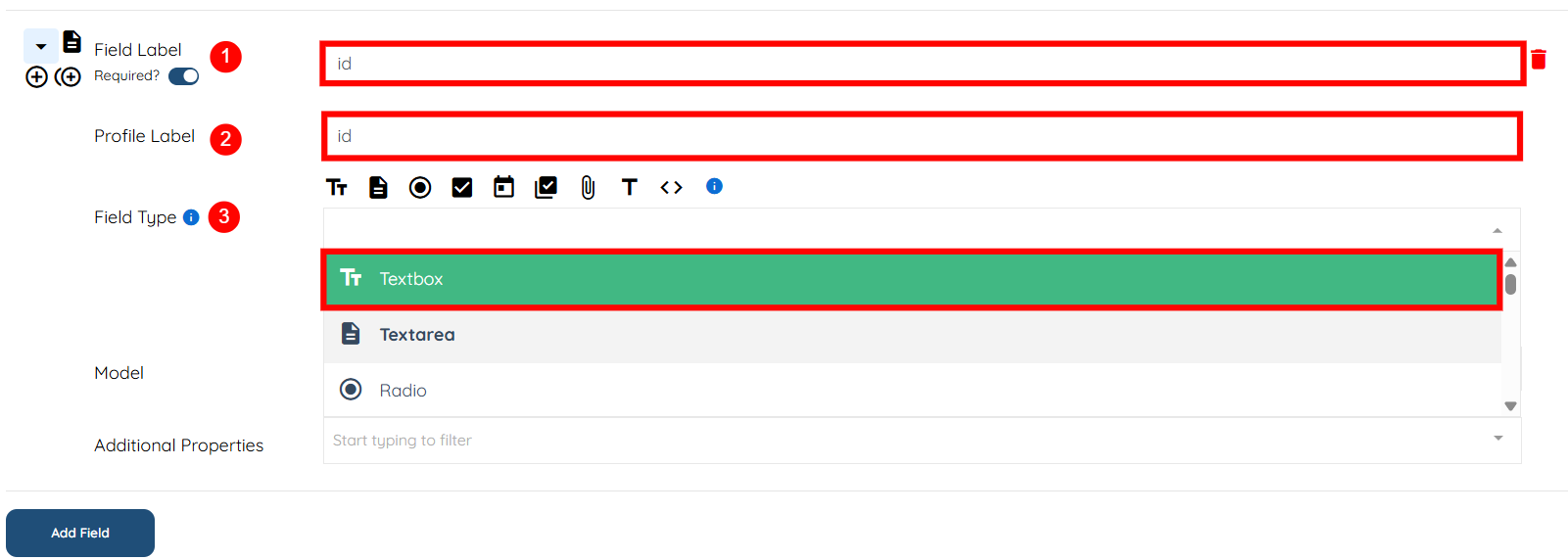 Step 4: Provide all the required details necessary to add a new field. For demo purposes, we add an ID field label, set the Profile Label also to ID, and choose Textbox as the Field Type.