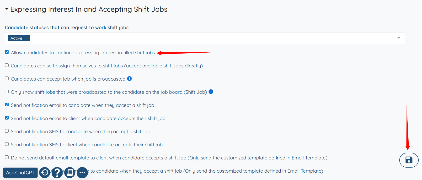 Step 6: Check the Allow candidates to continue expressing interest in filled shift jobs checkbox, and then click the Save icon to proceed.