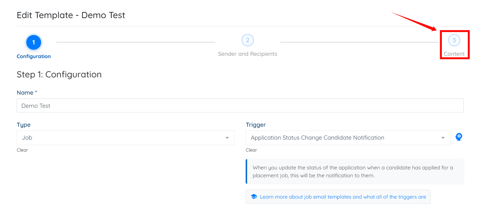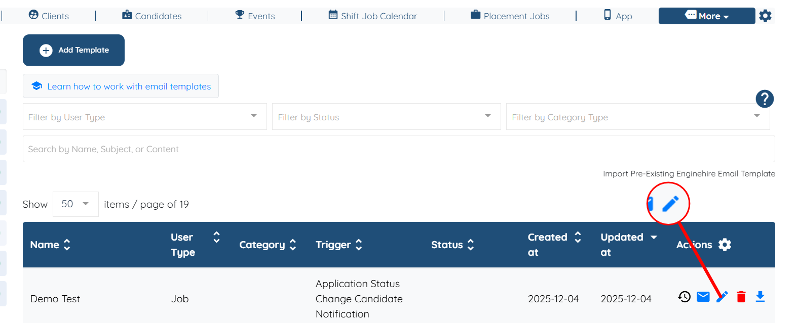 Step 2: Locate the Application Status Candidate Notification Template where you want to add the placement job tags, and click the corresponding pencil icon in the Actions column to edit it.