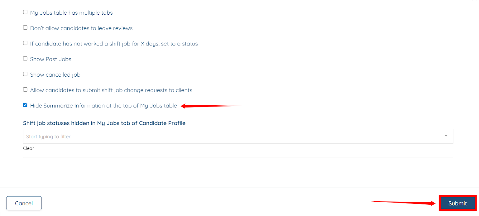 Step 6: Check the Hide Summarize Information at the top of the My Jobs table checkbox and click the Submit button to save the changes.