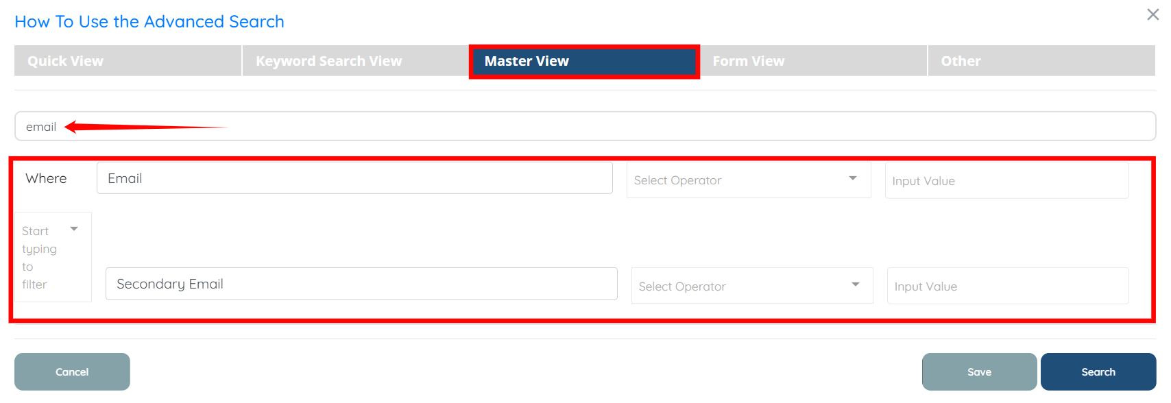 Step 3: Under the Master View, search for the specific field you are looking for in the search bar, and it will appear just below the search bar. For example, Email.