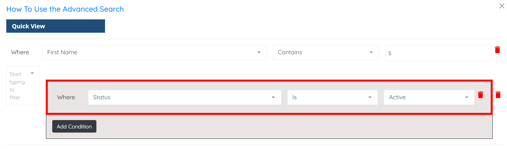 For demonstration purposes, we have added a second condition: Status → Is → Active.