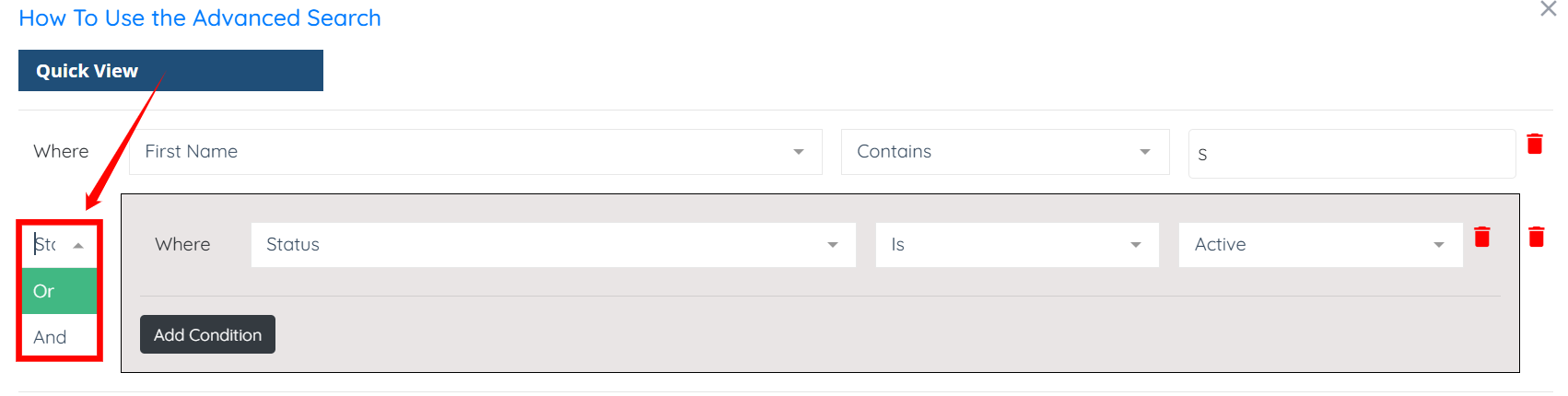 Select “Or” to show applicants who meet either condition, for example, applicants whose first name contains “S” or applicants with an Active status.