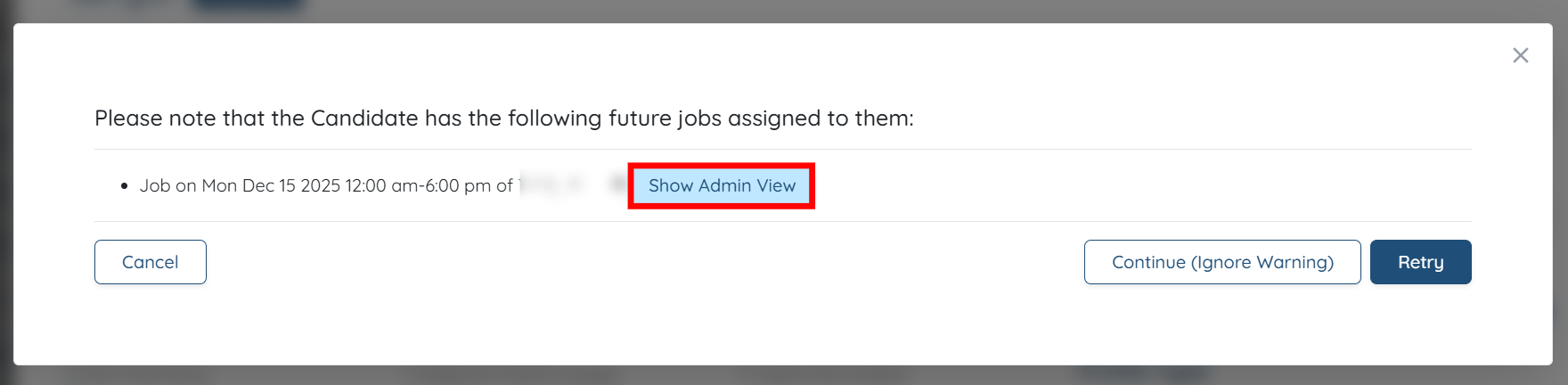 Step 4: You will receive an alert stating that the candidate has the following future jobs assigned to them. Click the Show Admin View button to check more details on the assigned future jobs.