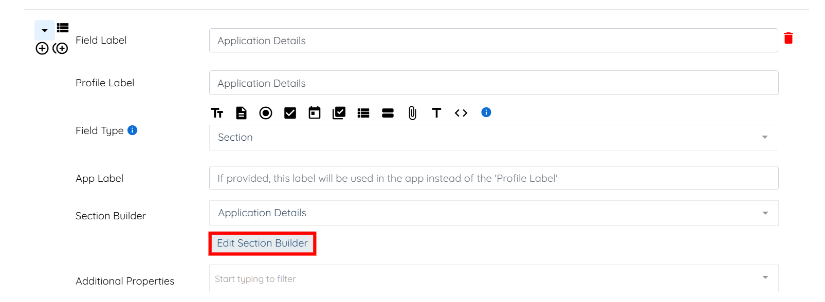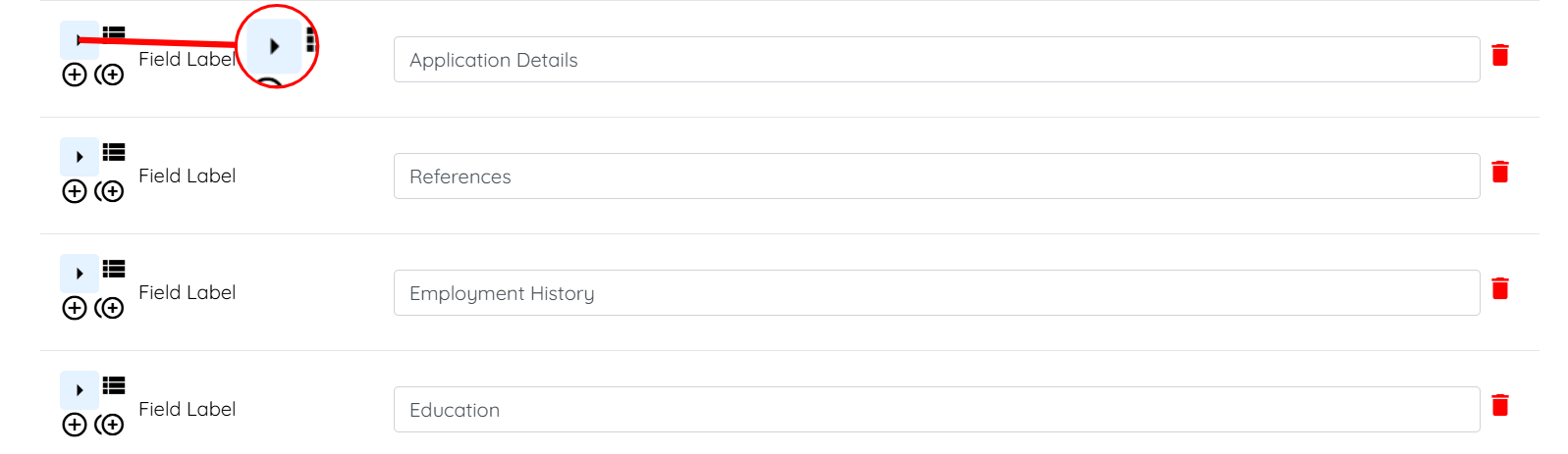 Step 2: Locate the field where you used a section builder, and click the arrow button to expand its details.