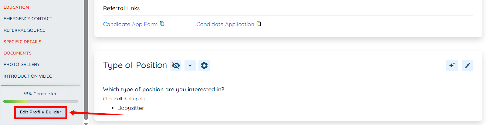 You can also set up the email notifications to receive updates whenever a candidate submits information for a specific section in their profile using the Edit Profile Builder option.