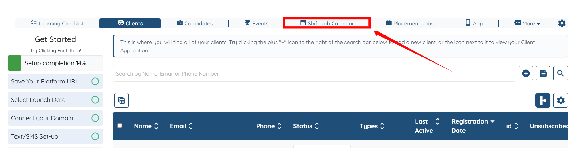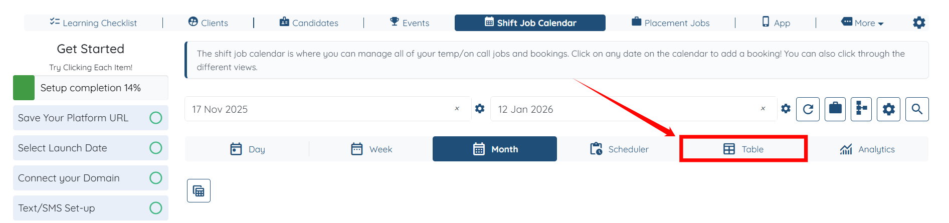Step 1: Log in to your agent dashboard and click Shift Job Calendar in the top navigation bar.