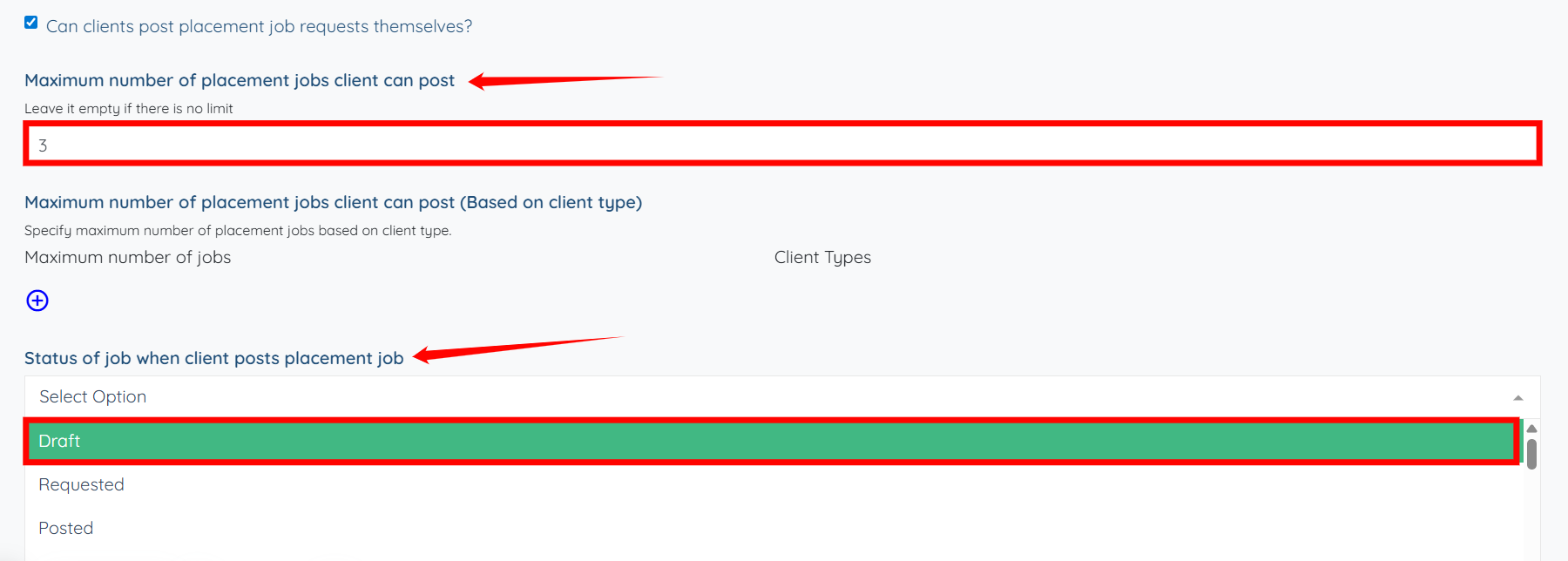 Step 5: Enter the Maximum number of placement jobs client can post and then select the Status of job when client posts placement job from the dropdown.