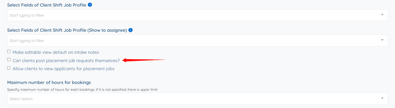 Step 4: Scroll down and check the Can clients post placement job requests themselves? checkbox.