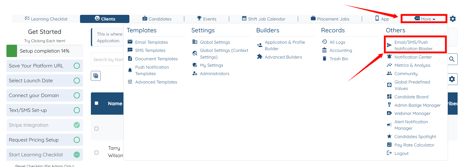 Step 1: Log in to your agent dashboard and click More > Email/SMS/Push Notification Blaster, as shown in the screenshot below.